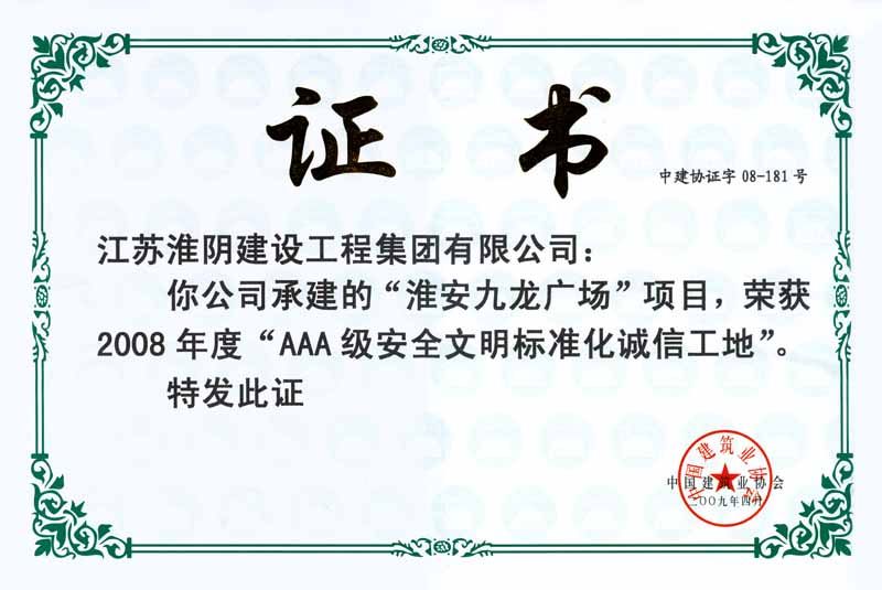 2009年AAA级安全文明标准化诚信工地-张洪滨
